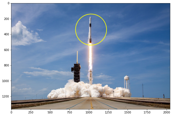 image_circle=input_img.copy() cv2.circle(image_circle, (1030,340),200, (0,255,255), thickness=5,lineType=cv2.LINE_AA) plt.figure(figsize=(10,10)) plt.imshow(image_circle[:,:,::-1]) plt.show()
